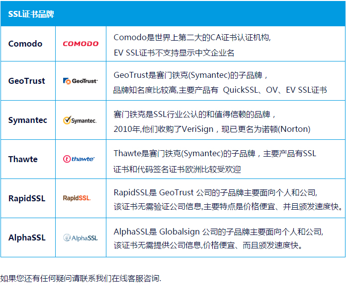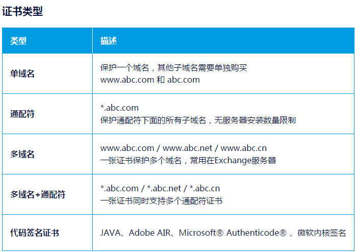 先确認需要購買SSL證書(shū)的域名數(shù)量,根據證書(shū)類型來(lái)選擇。SSL證書(shū)驗證方式分為(wèi) DV SSL(域名驗證)、OV SSL(組織機構驗證)、EV SSL(擴展驗證) ,根據證書(shū)功能可(kě)分為(wèi) 單域名、通(tōng)配符、多(duō)域名、多(duō)域名+通(tōng)配符、代碼簽名證書(shū)、客戶端證書(shū),有(yǒu)何區(qū)别請(qǐng)看下面介紹。